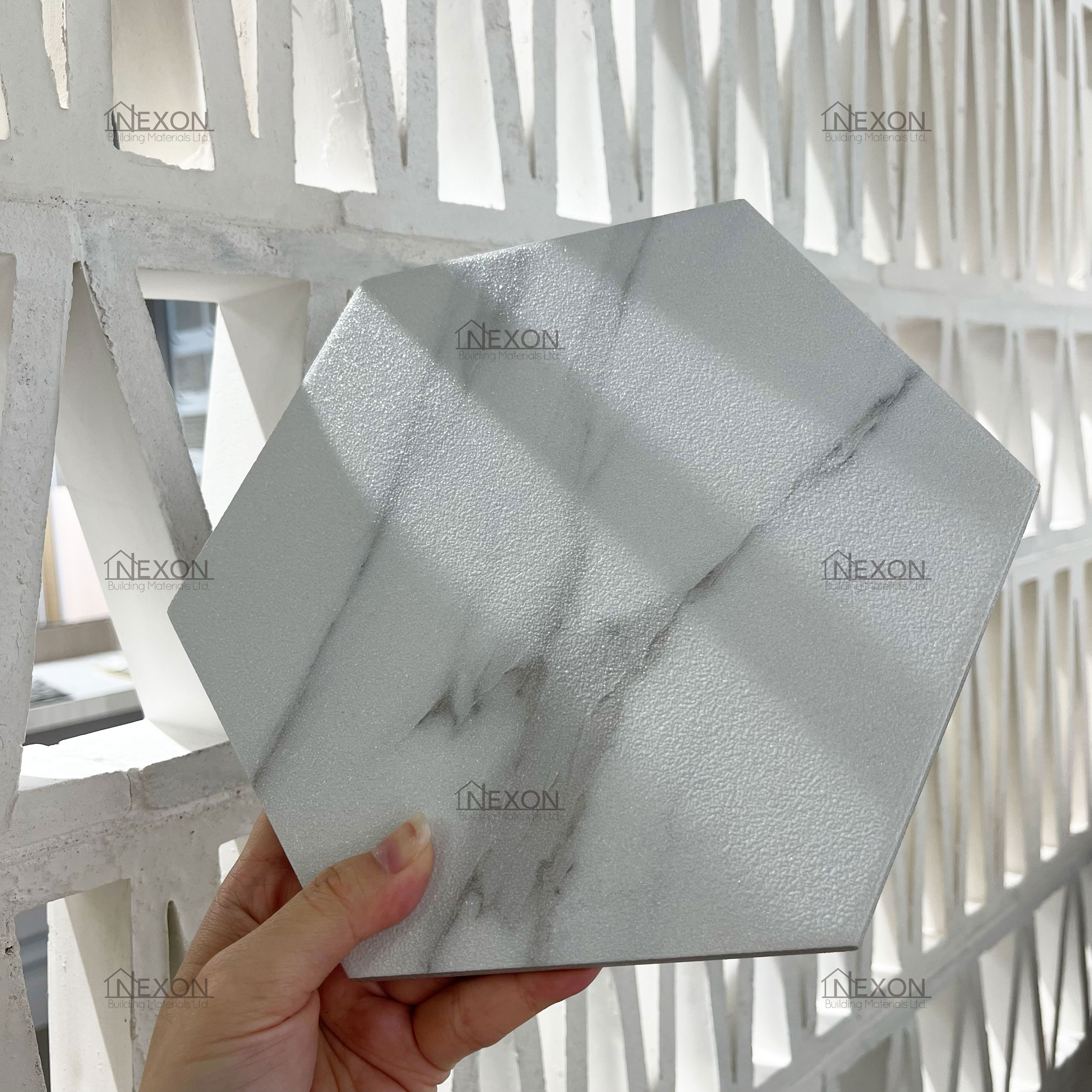 quare-shaped marble pattern tiles are commonly seen, it's time for a new twist! The granular surface refracts light, and each hexagonal tile is randomly imprinted with a subtle marble pattern. Designers can mix and match freely without overwhelming visual complexity. With our in-house mainland procurement team and a strong network of manufacturers, we have served a wide range of clients, including large-scale properties, museums, and restaurants. Feel free to visit our Wan Chai showroom to see the actual products.