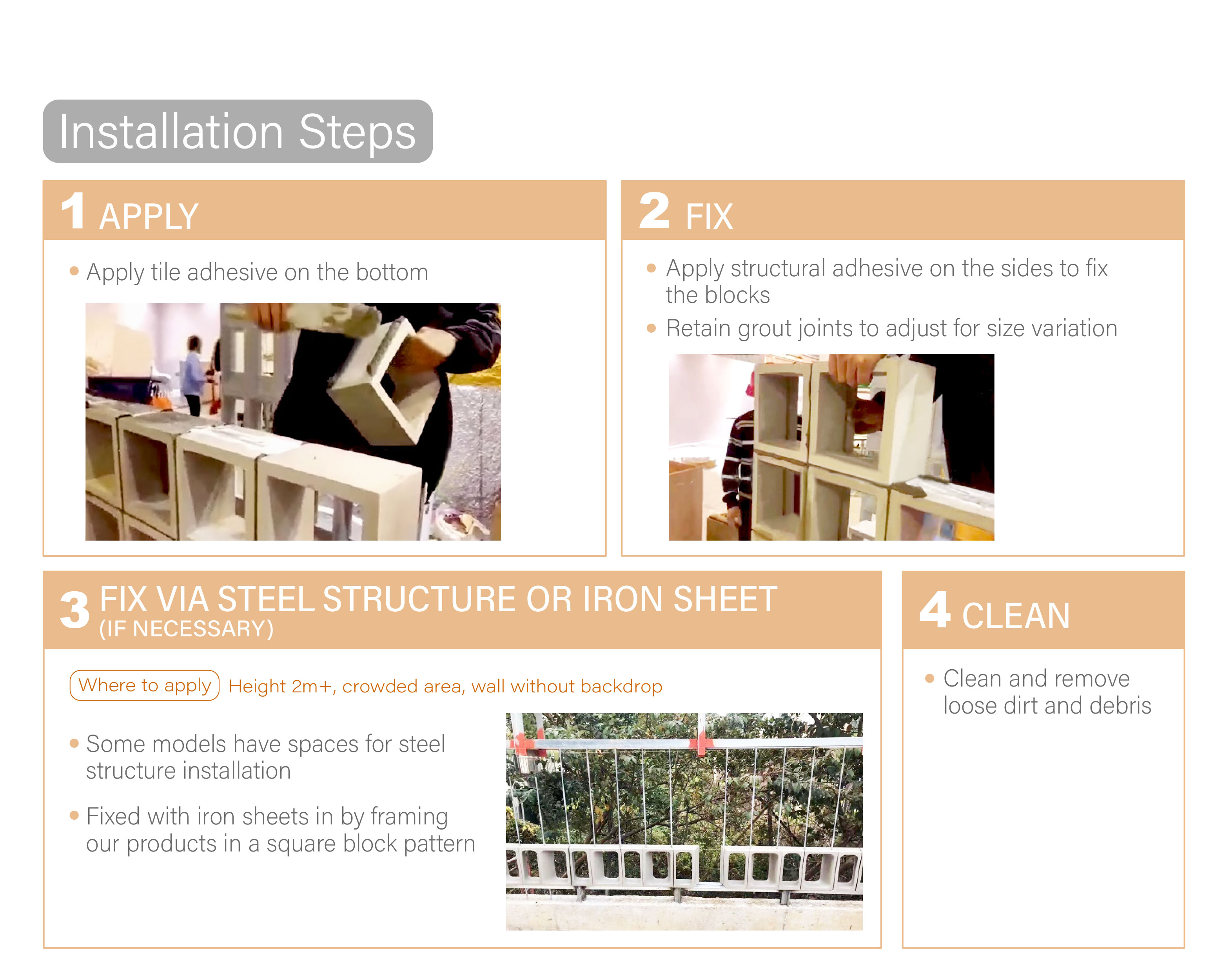 Environmentally friendly stone plastic blocks have special styles. They are made by extruding stone powder mixed with plastic particles. Different placement methods can create different visual effects.. It is very suitable for partition walls and can also be used for decorative purposes. Environmentally friendly stone plastic blocks are suitable for indoor and outdoor use, waterproof, BS476 and EN grade fireproof, termite-proof and formaldehyde-free, use tile adhesive to connect blocks to easily create a feature wall. This product has obtained a number of international environmental certifications and is committed to creating sustainable building materials. The original factory of environmentally friendly stone plastic blocks has obtained many domestic and foreign professional production certifications. Ensure that the quality of the finished product meets the standards. |