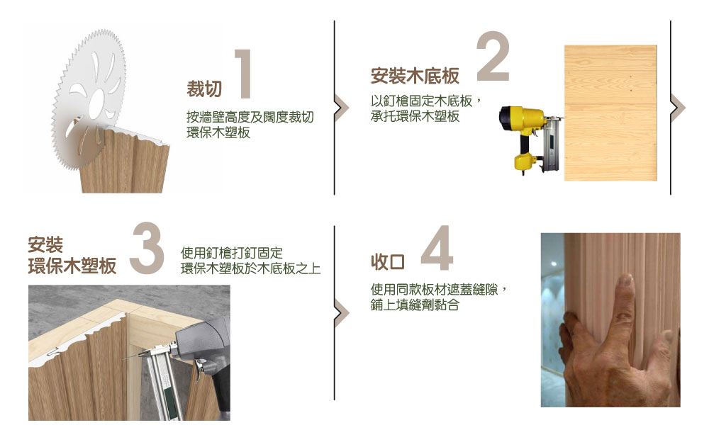 環保木塑板以木粉及環保膠粒混合製成,有效避免傳統實木的缺點:材質輕薄及安裝簡易;顏色為通體一致,共設12款純色,部分型號更可彎曲。主要功能包括:防水、EN級防火、防白蟻及無甲醛釋放等等。產品以組件式發售,安裝只須釘槍及木底板,有效節省工錢。 |