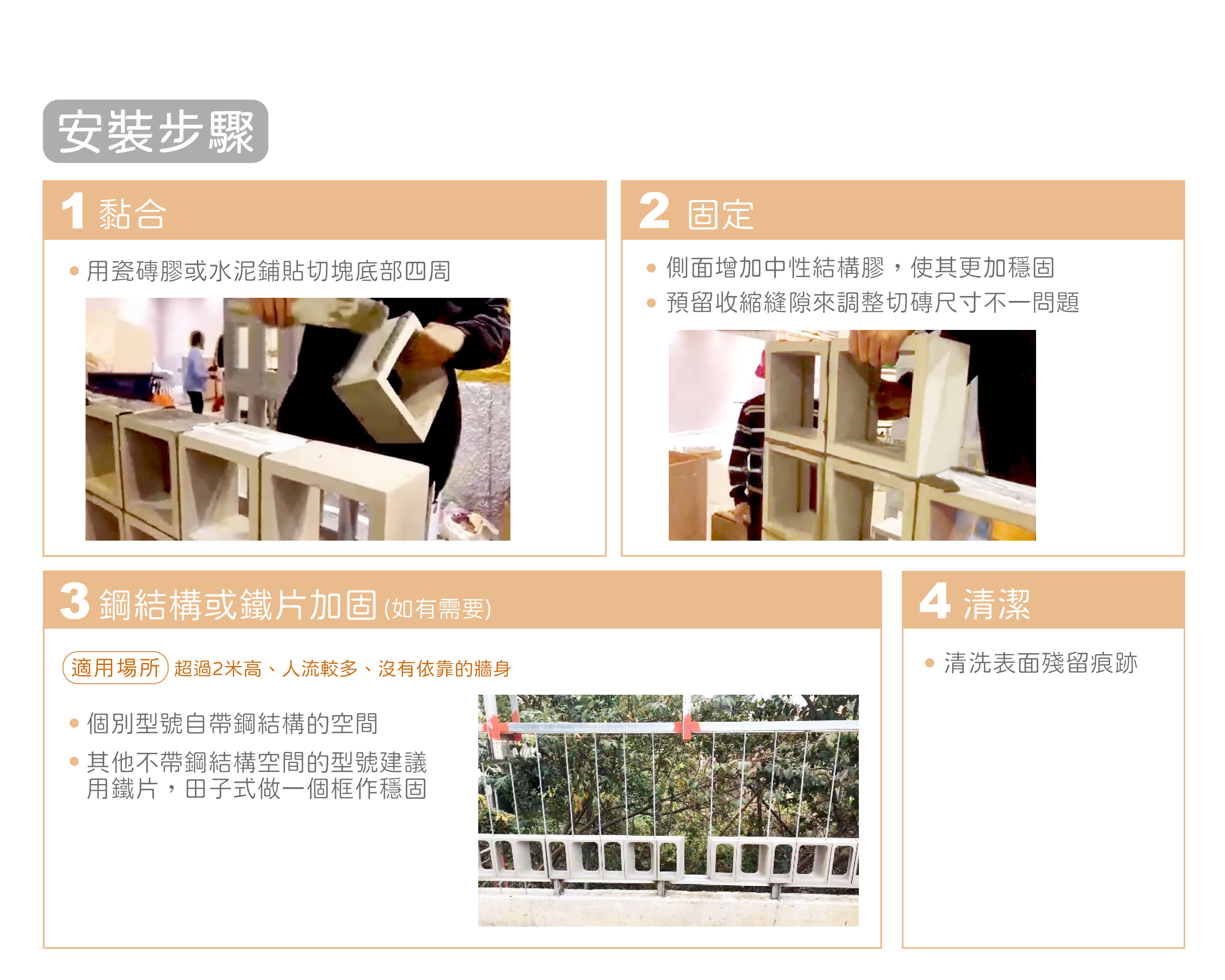 環保石塑磚款式特別,由石粉混合膠粒擠壓而製成,不同擺法可做出不同視覺效果,很適合做間隔牆,亦可用作裝飾用途。環保石塑磚適合室內室外使用,防水、BS476及EN級防火、防白蟻及無甲醛釋放,以瓷磚膠連接磚塊,輕鬆打造特色牆。本產品已獲得多項國際環保認證,致力打造可持續建材,同時環保石塑磚的原工廠已獲得多項國內外專業生產認證,確保成品質素符合標準。 |
